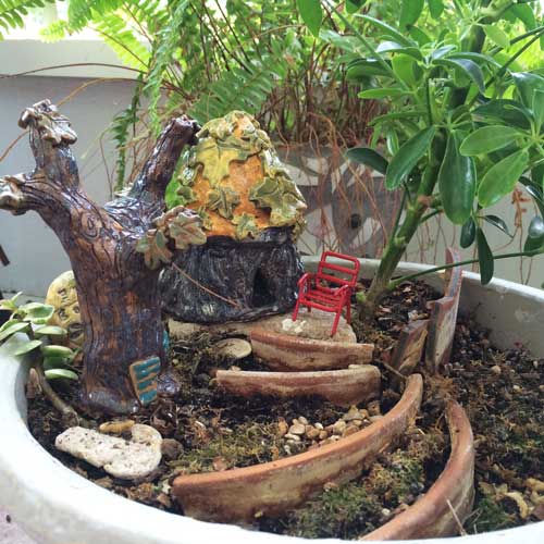 Craft stores now have lots of fairy garden items including tiny chairs, umbrellas, fish ponds, and beautiful little fairies. Etsy.com is a great place to shop for handmade items for your fairy garden. You will find doors to lean against trees and a huge assortment of houses and accessories. Shop day or night and click on your favorites to store them as a collection. Then you can see how well they go together. You can purchase a few or many.