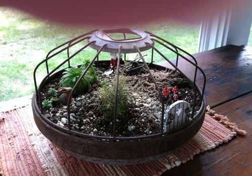 Lynn was probably the person who first introduced me to fairy gardening and miniatures, although I can’t remember the exact moment. She has such an artistic eye for putting things together. Here is one of her container gardens. It is a re-purposed chicken feeder that is home to a tiny little gnome, a wheel barrow with tiny tools, a welcoming garden gate, small scale plants and a tiny stone garden path. Her visions inspire me and I can’t wait to visit her again this year to see what new delights I will find in her home and her backyard over a glass of iced tea.