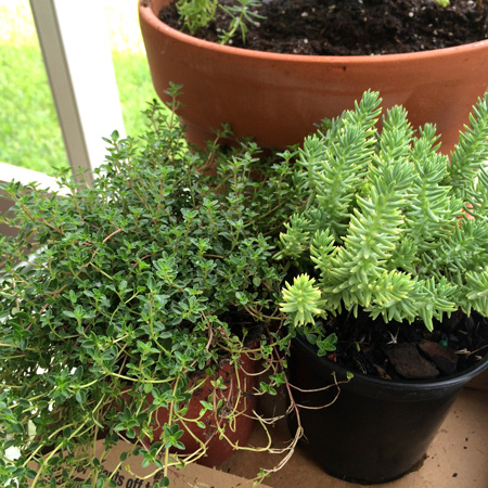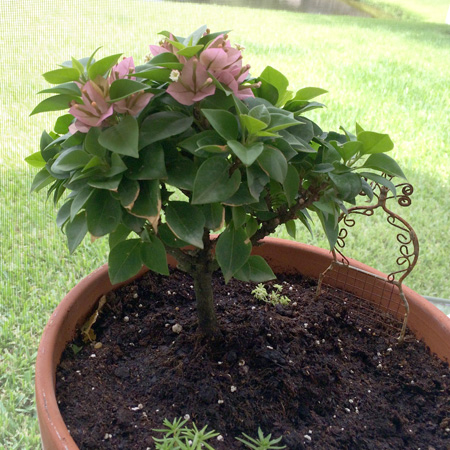 Next you will need some plants that will fit into a miniature scheme. Look for plants with smaller leaves. Small evergreens are often found in garden centers, produce sections of grocery stores, and in flower shops. Herbs make great fairy garden “trees”. Rosemary and Thyme have woody stalks that can be trimmed to look like trees, plus you get to enjoy the herbs in your cooking and the wonderful scents of the plants. Small scale succulents also make nice plants. Keep your eyes open. You will be surprised at how you look at plants differently when you gear your thinking to a miniature scale. I have a tiny bougainvillaea that is only about eight inches tall. It is in a medium sized flower pot and is trimmed to look like a “tree”.
