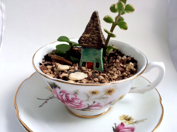 I also have some live, completed fairy gardens. My larger gardens have fairy houses, paths, miniature fairy mailboxes or tiny ponds, and live miniature scale plants. My miniature gardens have tiny plants and miniature fairy houses. I even have some in tea cups.