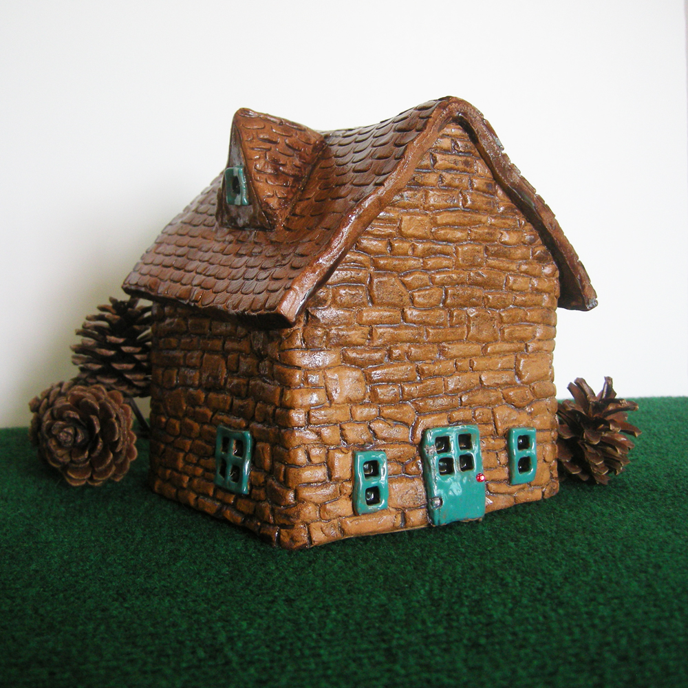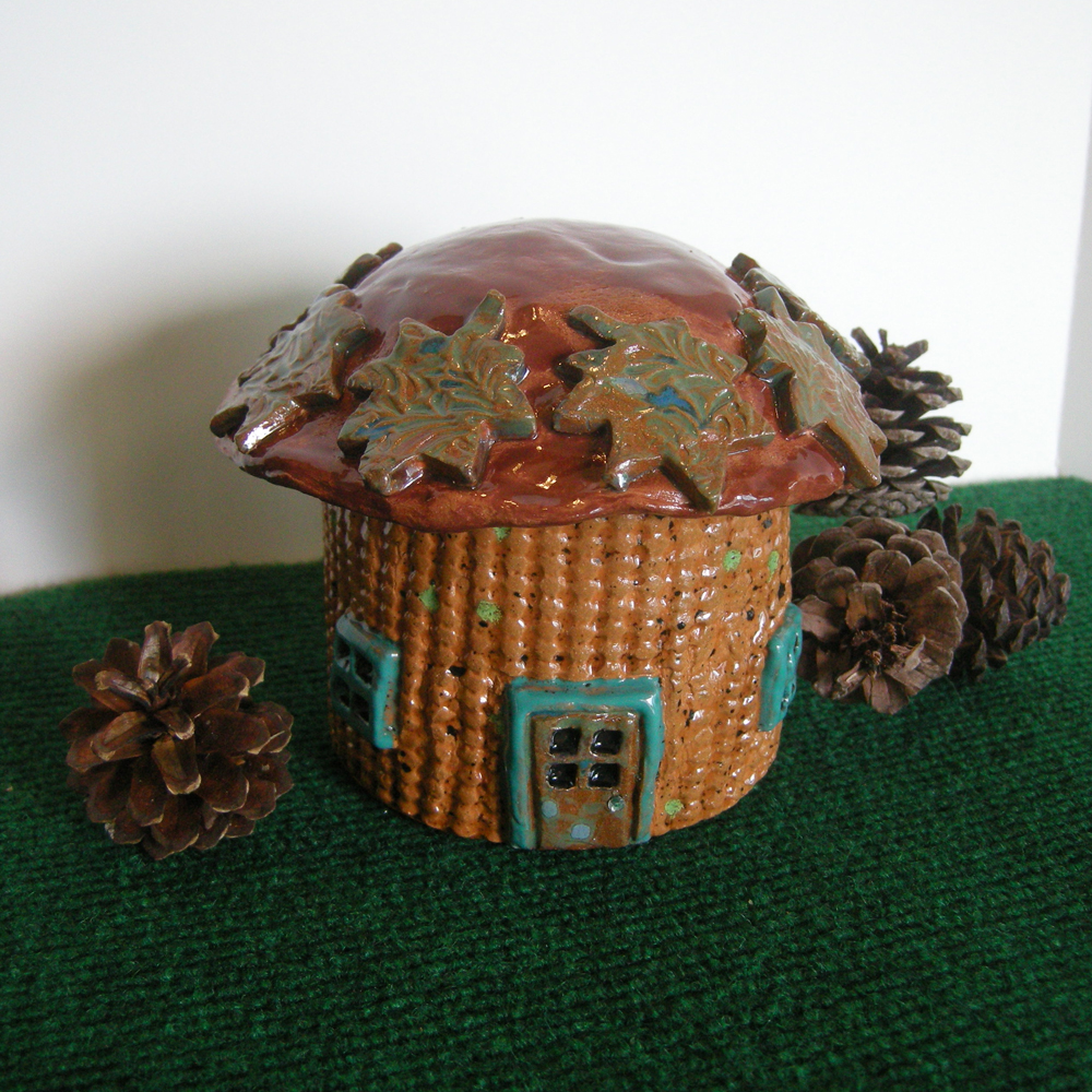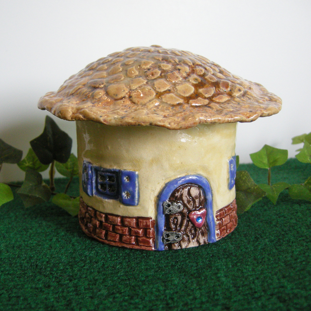 I have two new styles of fairy garden houses. All are perfect for outdoor fairy gardens. The first style is the barrel shaped house. I have created some base molds from my original sculptures, then I add the details and the roof after the clay is released from the mold. Every house ends up unique in shape, form, texture. Most houses have a tiny acrylic “enchanted jewel” for a door handle which is added after the two firings in the kiln.