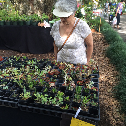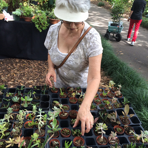 We moved throughout the show and visited nearly every single booth. Gorgeous roses, rare orchids and hibiscus, ferns, “blue-eyed” daisies, and LOTS of people with carts full of treasures. One booth had tiny succulents for only $1.00 each. You can see by the photos they were fairly well picked over. I already have quite a few so I simply looked for some that I didn’t already have.