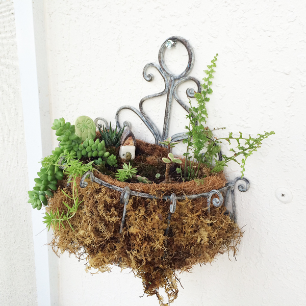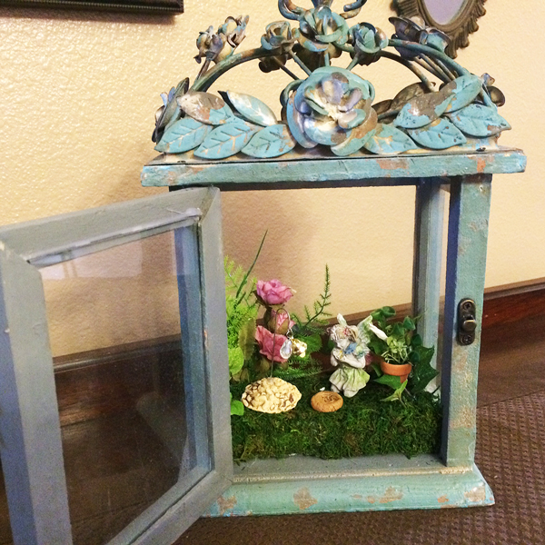 In the bird cages and wooden boxes I created miniature silk arrangements for a fairy scene. For other pieces I added soil and plants first, then looked through all of my accessories and added fences, walkways, houses, mailboxes, and small fairies. I usually spend a few days tinkering before I am satisfied. Once I’m satisfied I set the container in a place where it will get morning light