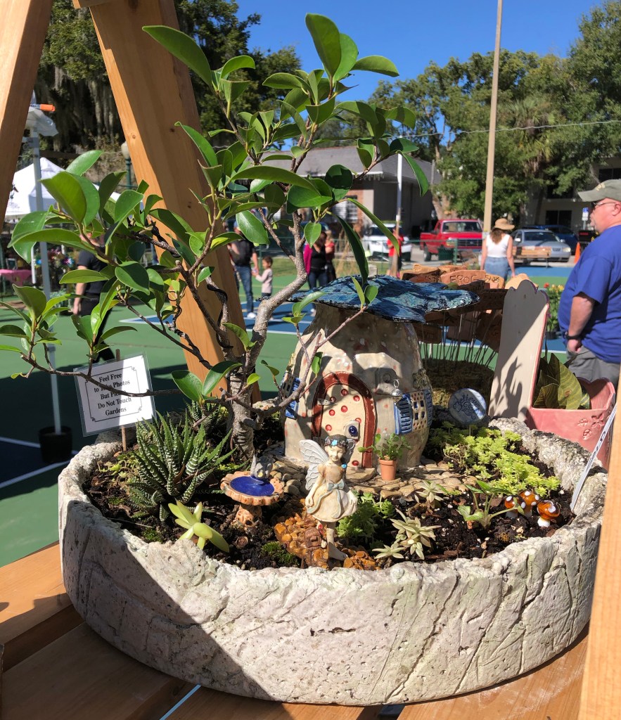 The little garden above was purchased by a happy fairy garden enthusiast in Mount Dora, Florida a few weeks ago at the annual plant sale. It features one of my large fairy houses, a bird bath, walkway, fairy and tiny glass mushrooms. My husband helps me make the papercrete containers for our gardens. I have a few more in the works in my back yard, so if you see me at an upcoming show you will see what is new!