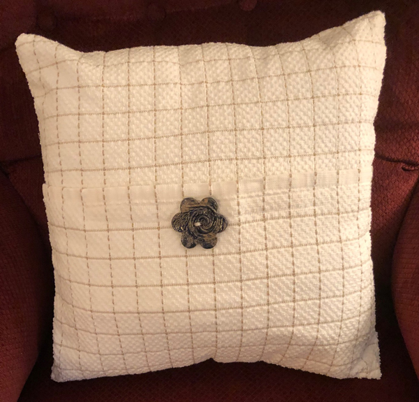 Here, Barb, sent photos of her pretty throw pillows featuring my handmade ceramic buttons. She used tea towels for the fabric. What a great idea! Inexpensive, and washable.
