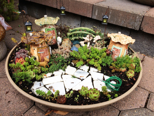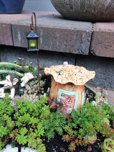 A new customer, Gretchen, purchased three of my fairy/gnome houses to create this adorable “Three Billy Goats Gruff” fairy garden.