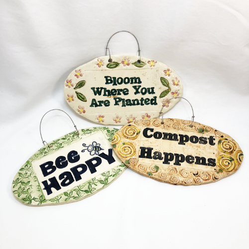 I have over 80 different sayings for my signs. I designed the text on my computer and ordered special stamps that I roll into the clay. I have lots of handmade stamps to create designs around the text. After firing three times, one bisque, and two glaze firings, I add stainless steel hanging wire. The wire is great for outdoor display because it resists rust.