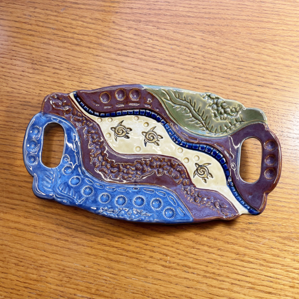 Textures are a weird kind of inspiration, but it’s true, texture inspires me. I am intrigued by shape and depth, which I love to use to create my bisque-ware stamps for jewelry and pottery. I like woven baskets, floral patterns, leaves, and natural textures, and you can see a lot of physical patterns in my work. I’m currently working on a new line of highly textured kitchenware. Here is a sample that will be shown at a local gallery show for the upcoming Christmas holidays.
