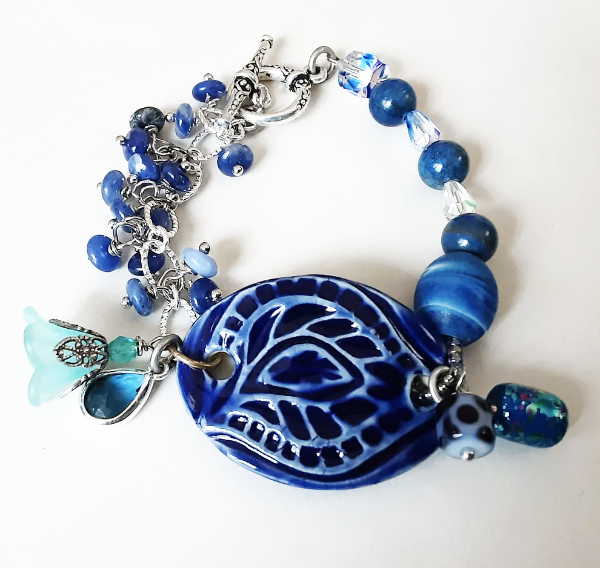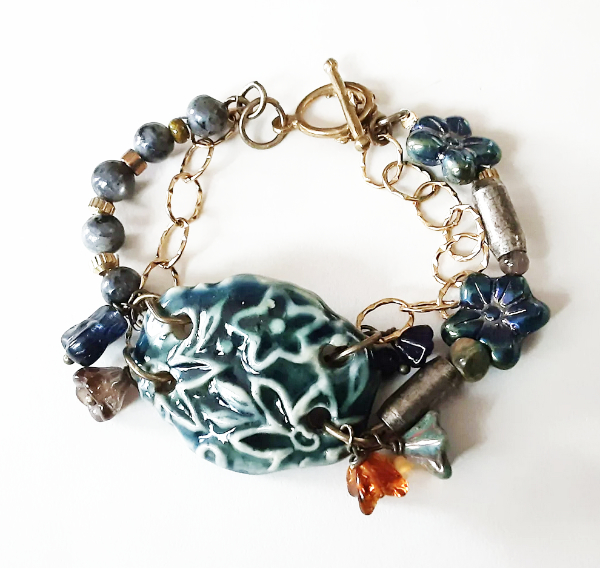 Working with any artisan beads, whether lampwork, enameled, or ceramic, is fun, but she really loves working with gemstones. Thanks, Jane, for using some of my ceramic pieces in your work.