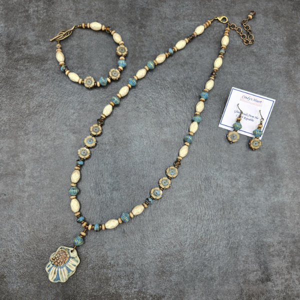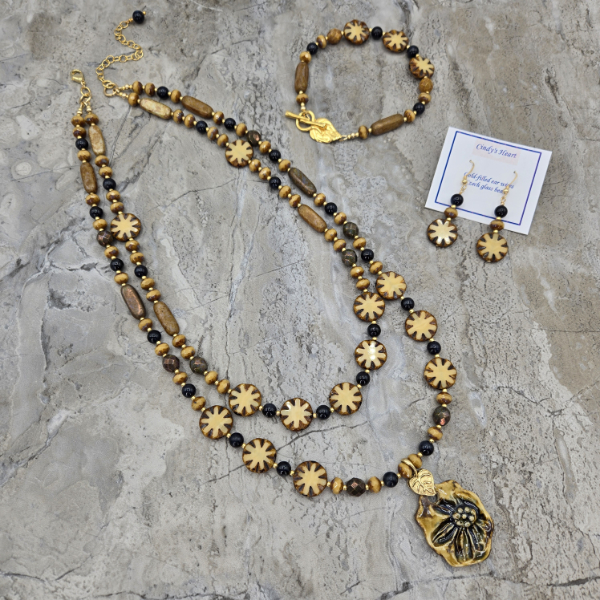 Value to customers is important. Cindy always creates complete 3-piece sets (necklace, earrings, bracelet) when she has enough materials and, if not, then 2-piece sets (necklace, earrings). She always sells the complete sets together which creates a good value and convenience for her customers. Her goal is to make quality jewelry sets that have some complexity and are not just simple stringing of beads. The sets are also easy to wear and fuss-free.